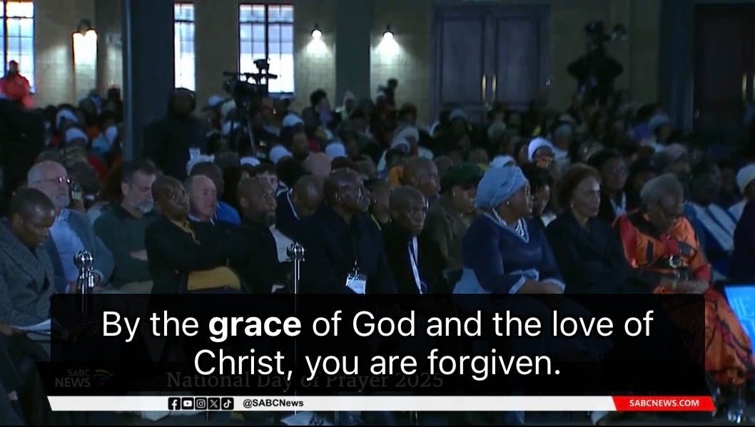In June 2025, during an ecumenical National Day of Prayer service at Grace Bible Church in Soweto, the South African Council of Churches led a collective confession of sins. The congregation confessed colonialism, apartheid, racism, corruption, violence, injustice. Then a Catholic bishop, Sipuka, declared forgiveness: “By the grace of God and the love of Christ, you are forgiven.”