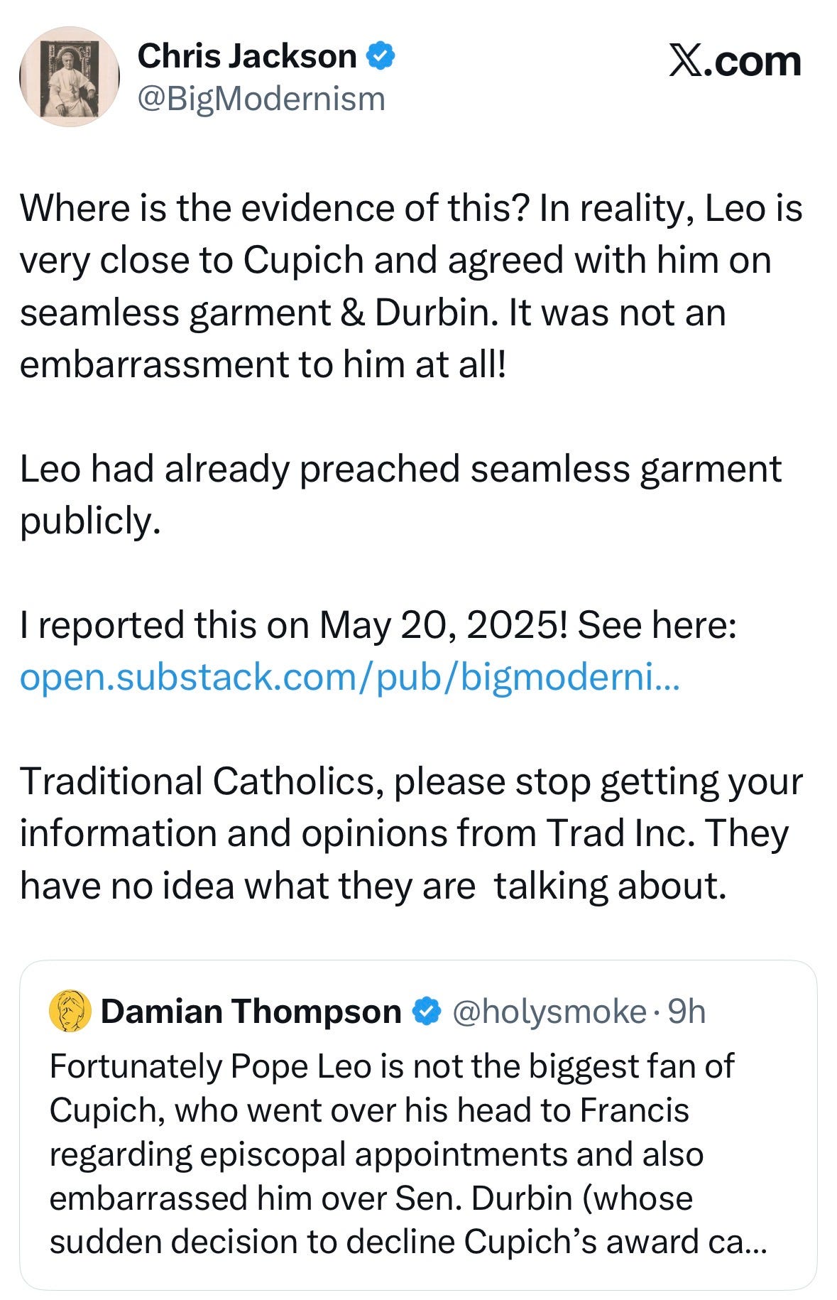The problem is that the comfort story never produces evidence, it produces misdirection: relax, the adults are managing it, the regime has guardrails, the worst actors are isolated, the faithful can stand down. The problem is that the record already shows Leo speaking the “seamless garment” moral framing in public, the same rhetorical ecosystem Cupich inhabits, the same flattening of priorities that dissolves Catholic moral clarity into a single, therapeutic continuum of “life issues.” The Durbin moment did not land as an “embarrassment” to Leo in any serious sense, since it harmonizes with the posture Leo has signaled and the circles he has moved in. Thompson is selling a narrative of distance from Cupich at the very moment Cupich is doing what Cupich always does, catechizing the public into thinking liturgy exists to be remodeled, then enforcing “unity” by treating the Roman Rite as the obstacle.