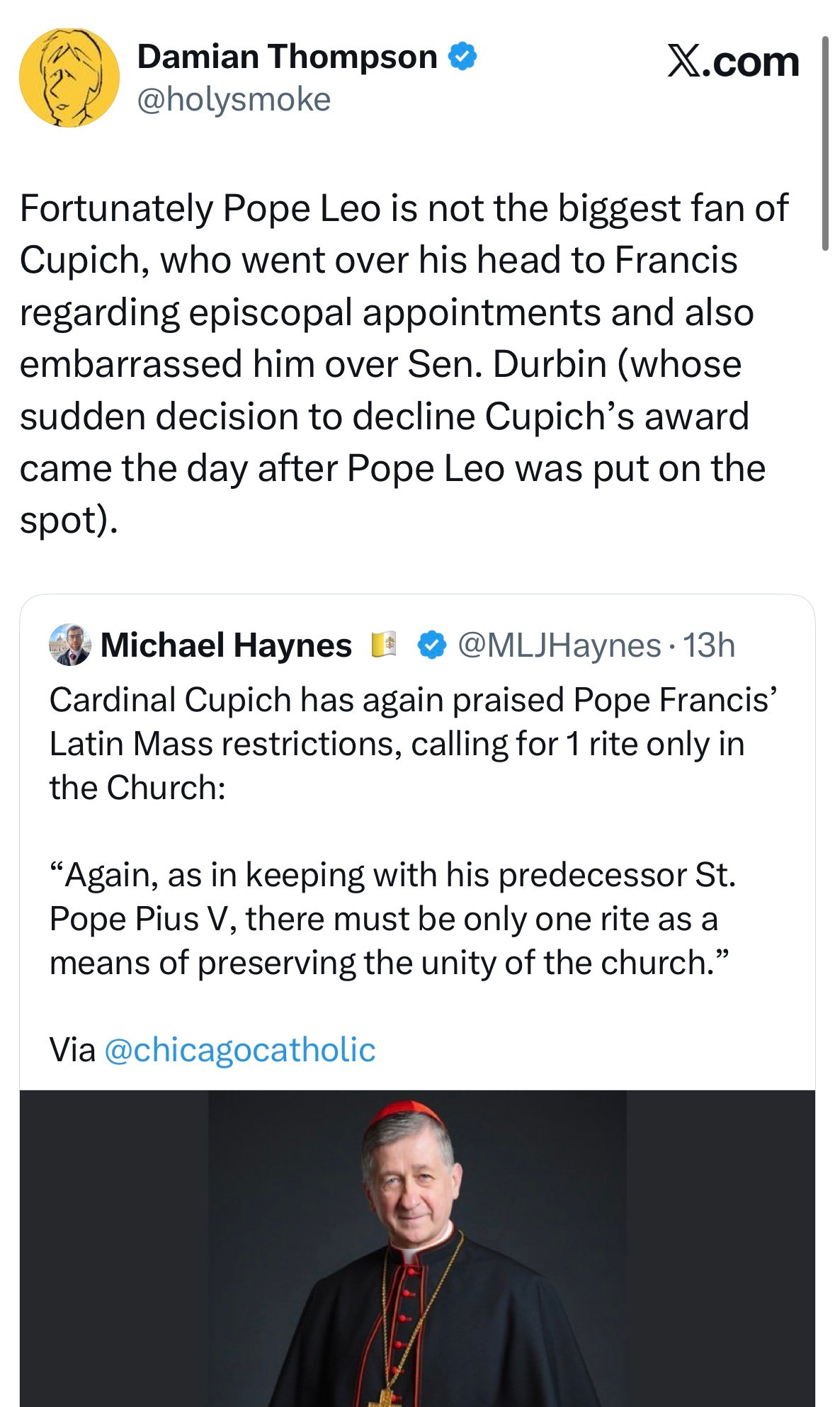 Thompson sees Cupich calling for “one rite” and reaches for the same tranquilizer he has used all through this cycle: don’t read the statement as a program, read it as a personality problem, a petty feud inside the court, some supposed friction between Leo and Cupich that will keep the damage contained. “Fortunately, Leo is not the biggest fan of Cupich,” he assures everyone, then he pads the story with insider-flavored color about Cupich “going over his head,” episcopal appointments, and the Durbin episode, as though the real issue in a public push toward liturgical uniformity is who embarrassed whom in the green room.