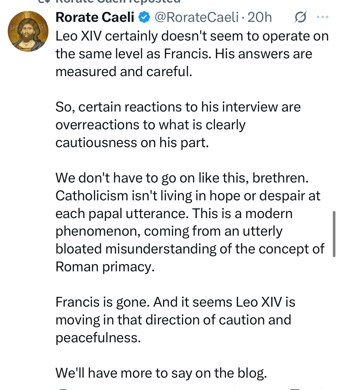 Rorate Caeli waves away concerns as “overreactions” and praises Leo’s “measured and careful” style.
