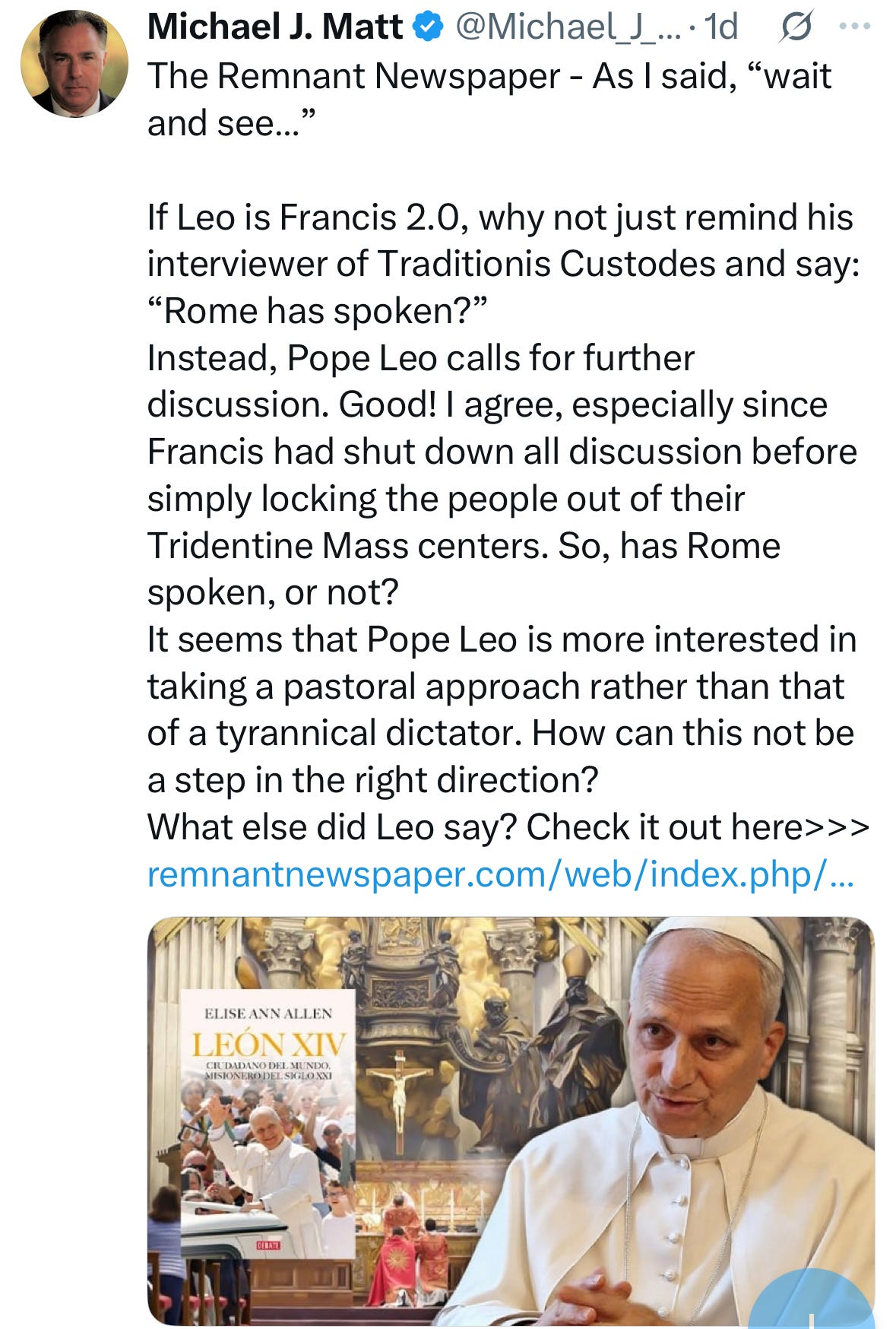 What Leo said about the Latin Mass is revealing, not for its theology, but for its politics. He admitted he has never really engaged with advocates for the Tridentine rite. Yet somehow he already knows what the “issue” is: polarization, ideology, division. In other words, if trads want their Mass, they must prove their loyalty by not being “ideological.”