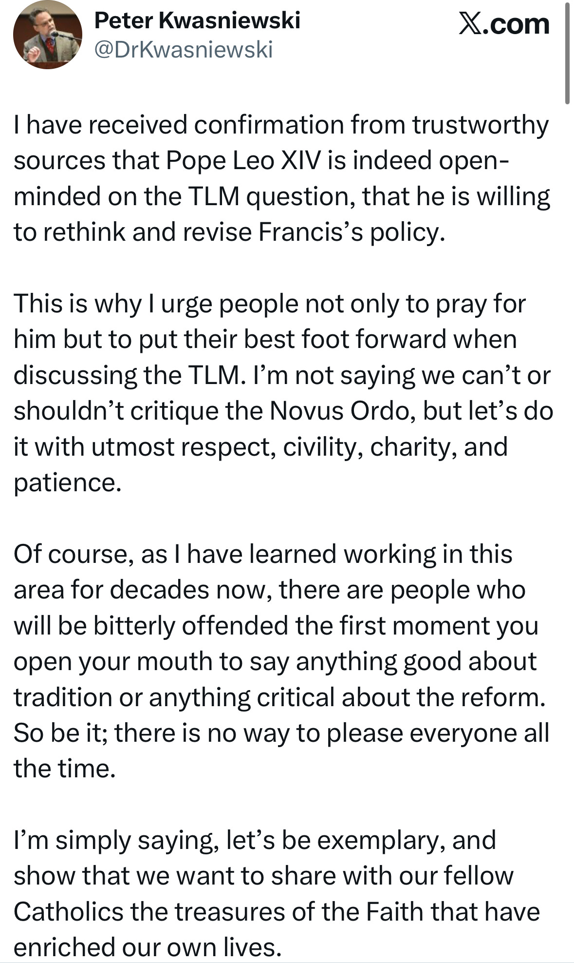 Kwasniewski counsels civility and patience, urging trads to put their “best foot forward” so Leo will look kindly on them.