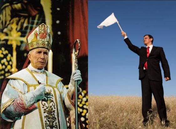 Trad Inc. leaders decided within twenty-four hours of Leo’s election to lay down their arms. They want the best terms of surrender they can get, even if it means living under a Church where sodomy is smiled upon, where doctrine depends on popular attitudes, and where the Tridentine Mass is reduced to a consolation prize.