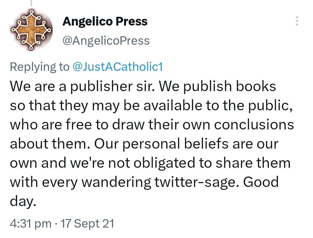 When confronted, Angelico defended itself curtly: “We are a publisher, sir… who are free to draw their own conclusions… our personal beliefs are our own.” But the question remains: who is choosing which personal beliefs to platform, and why now, in the name of Catholic tradition?