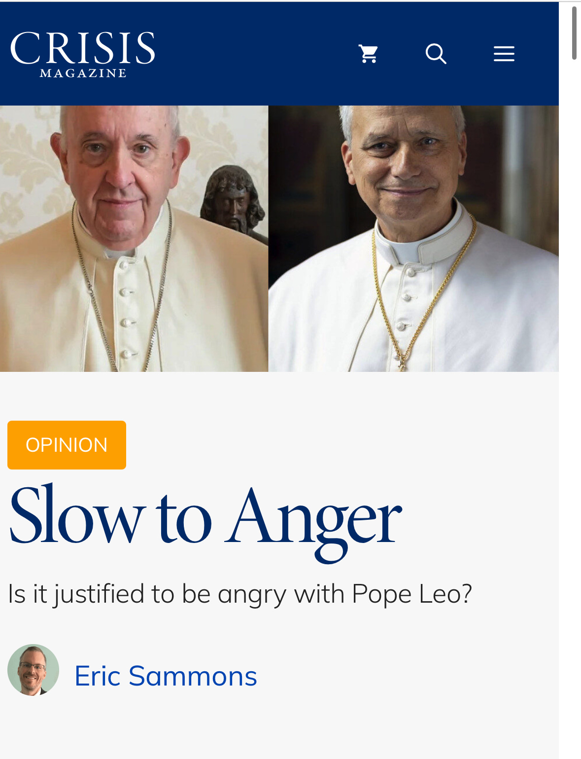 Eric Sammons, once proud to call Francis an abusive father, now calls Leo a misunderstood one. He tells us anger is unbecoming, that we must be “slow to speak, slow to anger.” This is not spirituality, but sedation. The crisis is not that Catholics are too angry but that they have been taught to feel guilty for righteous anger.