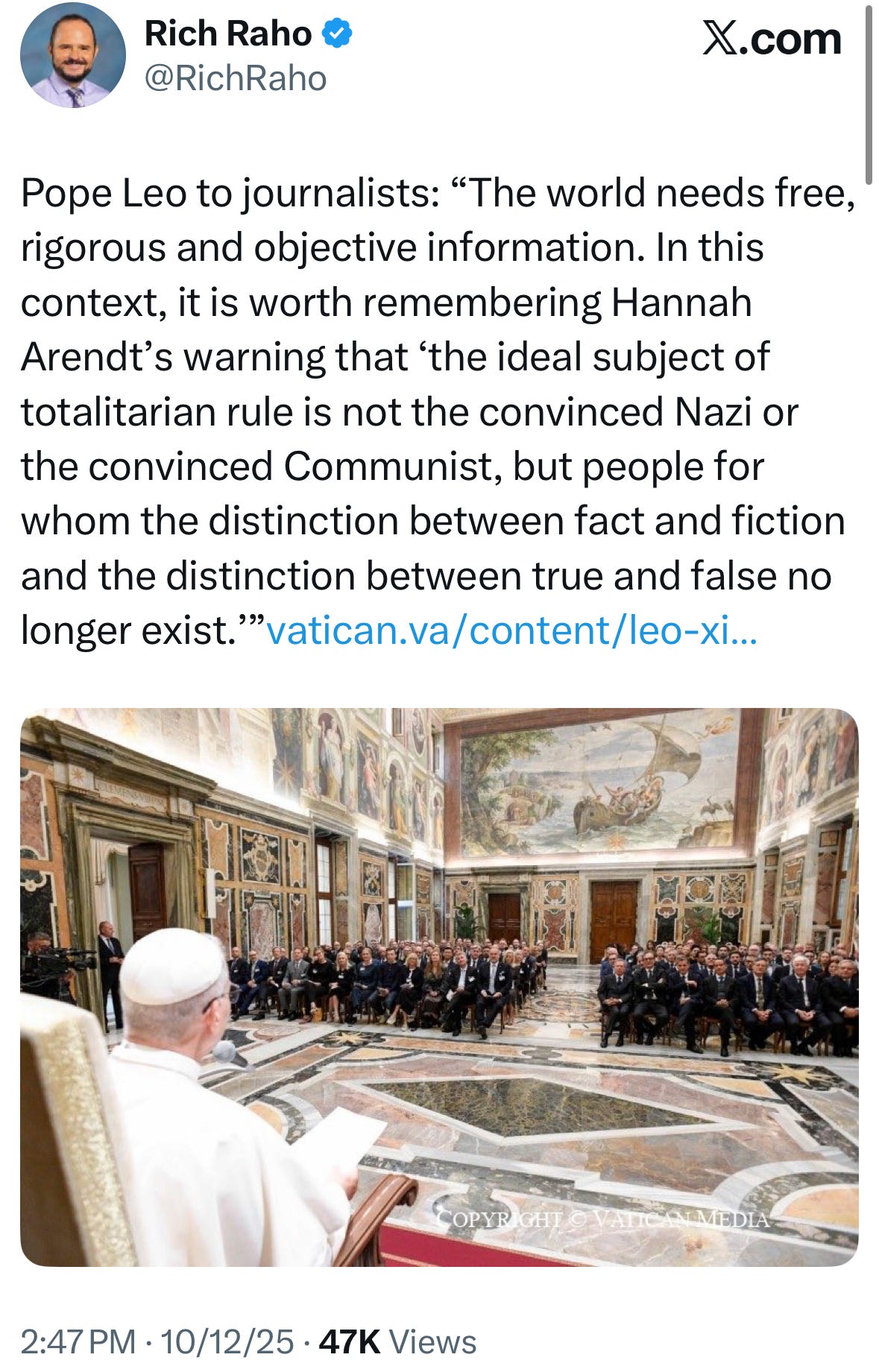 If there is one thing the post-conciliar Vatican excels at, it is moral projection. On October 12, Leo XIV stood before a hall of journalists and solemnly warned against the dangers of “false information.” Quoting Hannah Arendt, he lamented that totalitarianism begins when “the distinction between fact and fiction, and the distinction between true and false, no longer exist.”