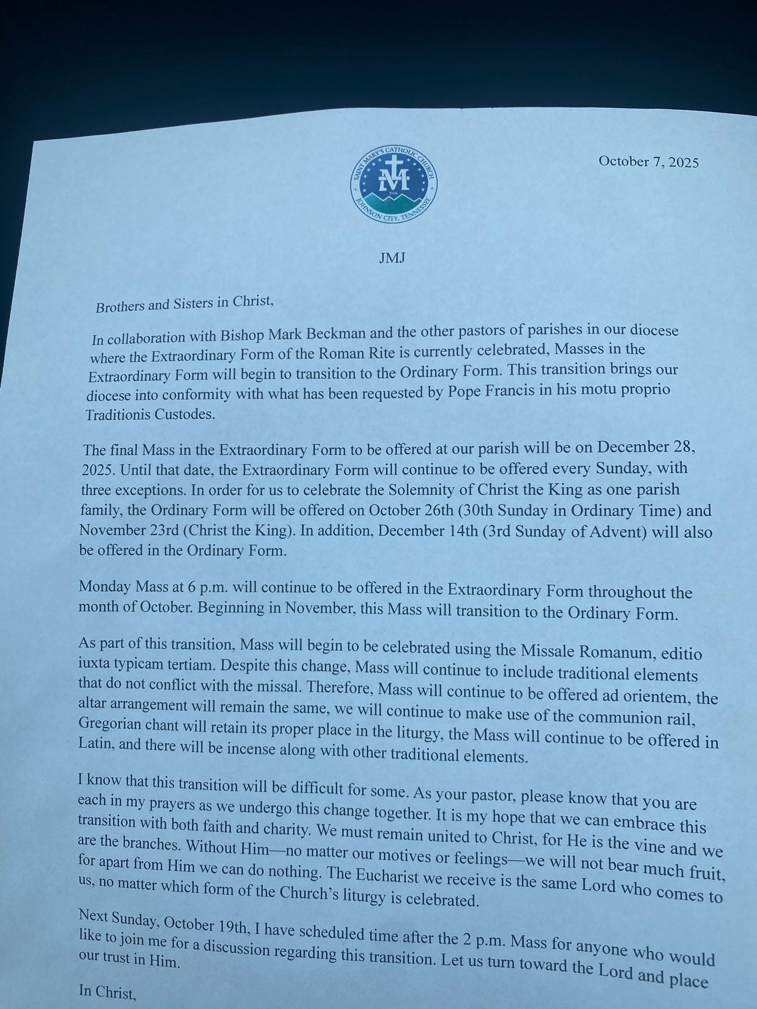 In Knoxville, Tennessee, the last candle of tradition is being snuffed out. The diocese has announced that all Traditional Latin Masses will cease by the end of 2025. The letter handed out at Holy Ghost parish was polite, measured, and devastating. It thanked the faithful for their patience as the Extraordinary Form “transitions to the Ordinary Form.” The priest promised the rail would stay, the Latin would remain, and the chant would linger, but only as decorative relics draped over the Novus Ordo.