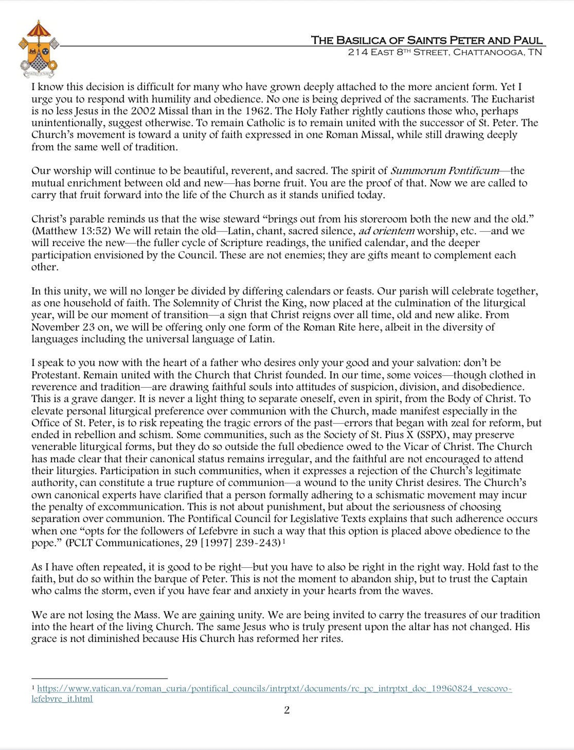 Fr. Carter begins by recounting the parish’s faithful observance of the 1962 Missal since 2014, only to pivot: “Since 2021 we have been living on borrowed time,” he writes. “We are not the masters of the liturgy; we are its servants.” The faithful, he insists, must embrace the “path of unity,” which in this case means total surrender.