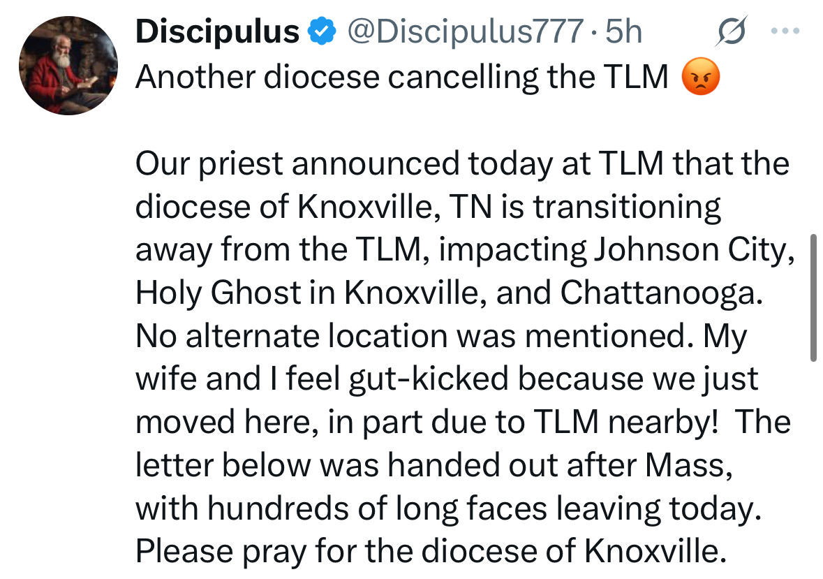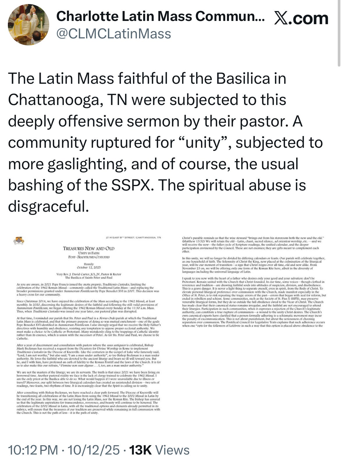 This, we are told, is obedience to Traditionis Custodes. In practice it is the mutilation of living tradition under the guise of “unity.” The faithful who uprooted their lives to live near a functioning TLM parish are now told to be patient and “trust.” The pattern is unmistakable: from Charlotte to Detroit to now Knoxville, Chattanooga, and Johnson City, bishops are preemptively enacting the will of Rome even before Leo XIV lifts a finger.