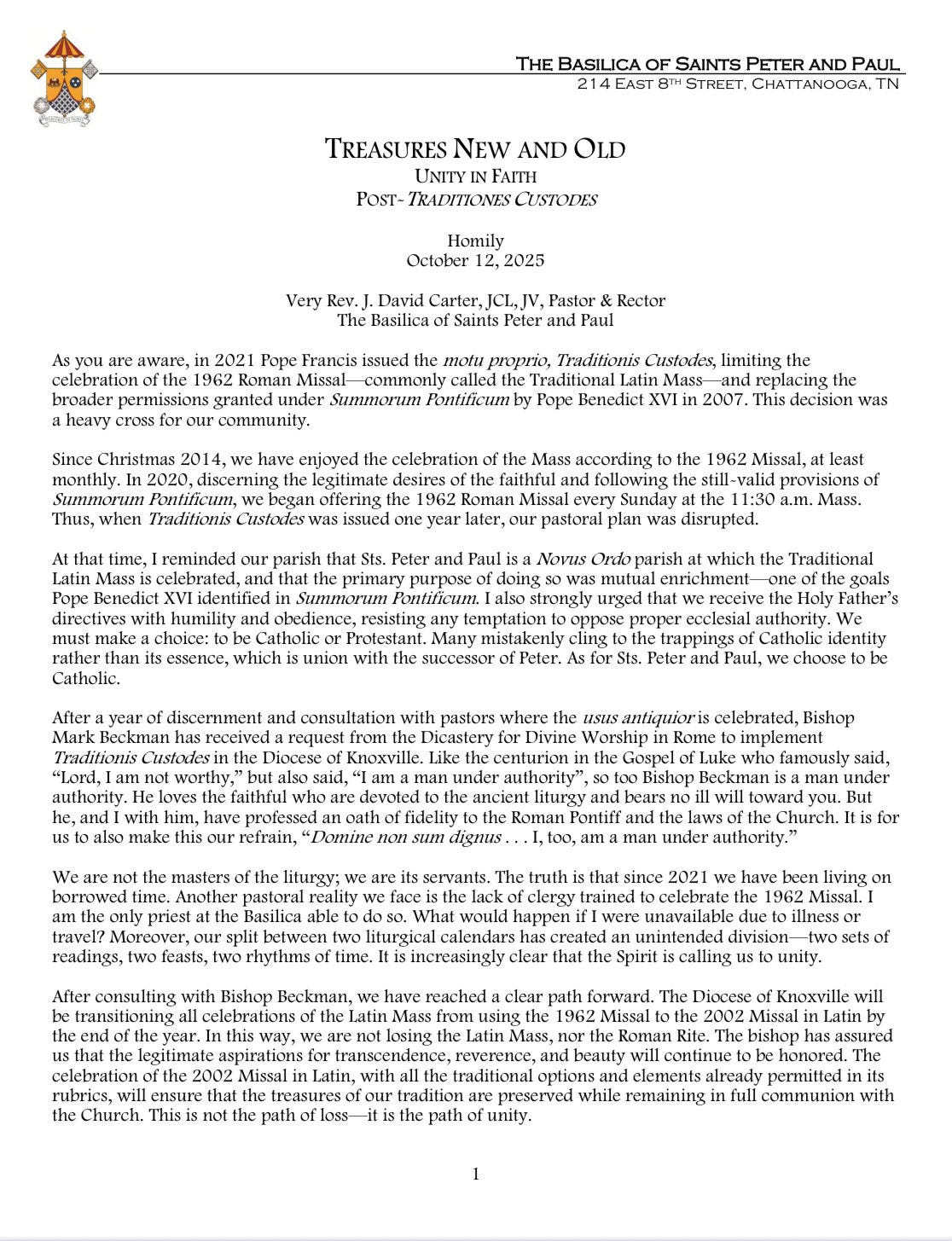 The homily by Fr. J. David Carter, titled “Treasures New and Old: Unity in Faith Post-Traditionis Custodes,” reads like a case study in clerical gaslighting. The text, handed out after Mass, is a portrait of a man pleading submission while crushing those who had already submitted.