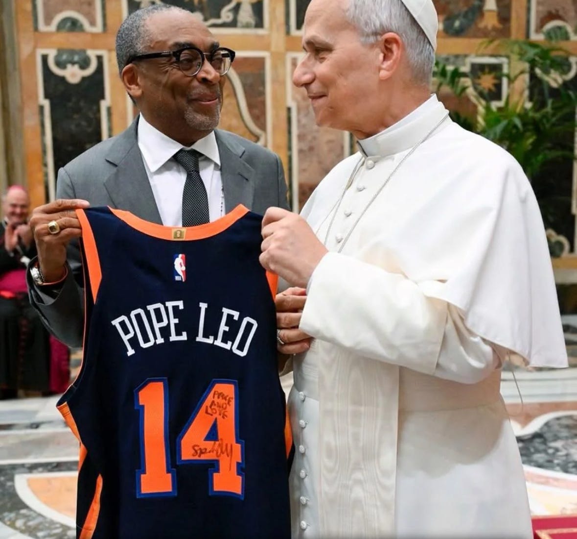 Cate Blanchett gives Leo XIV a UNHCR bracelet, Spike Lee hands him a Knicks jersey with “Leo 14” on the back, and the Vatican sells it as a Jubilee moment of “hope.” The guest list looked like Oscars night: Spike Lee, Blanchett, Judd Apatow, George Miller, Gus Van Sant, Abel Ferrara, Monica Bellucci, Viggo Mortensen, plus earlier audiences with De Niro and Pacino. The conspicuous absences, Gibson, Eastwood, Voight, Woods, were waved away.