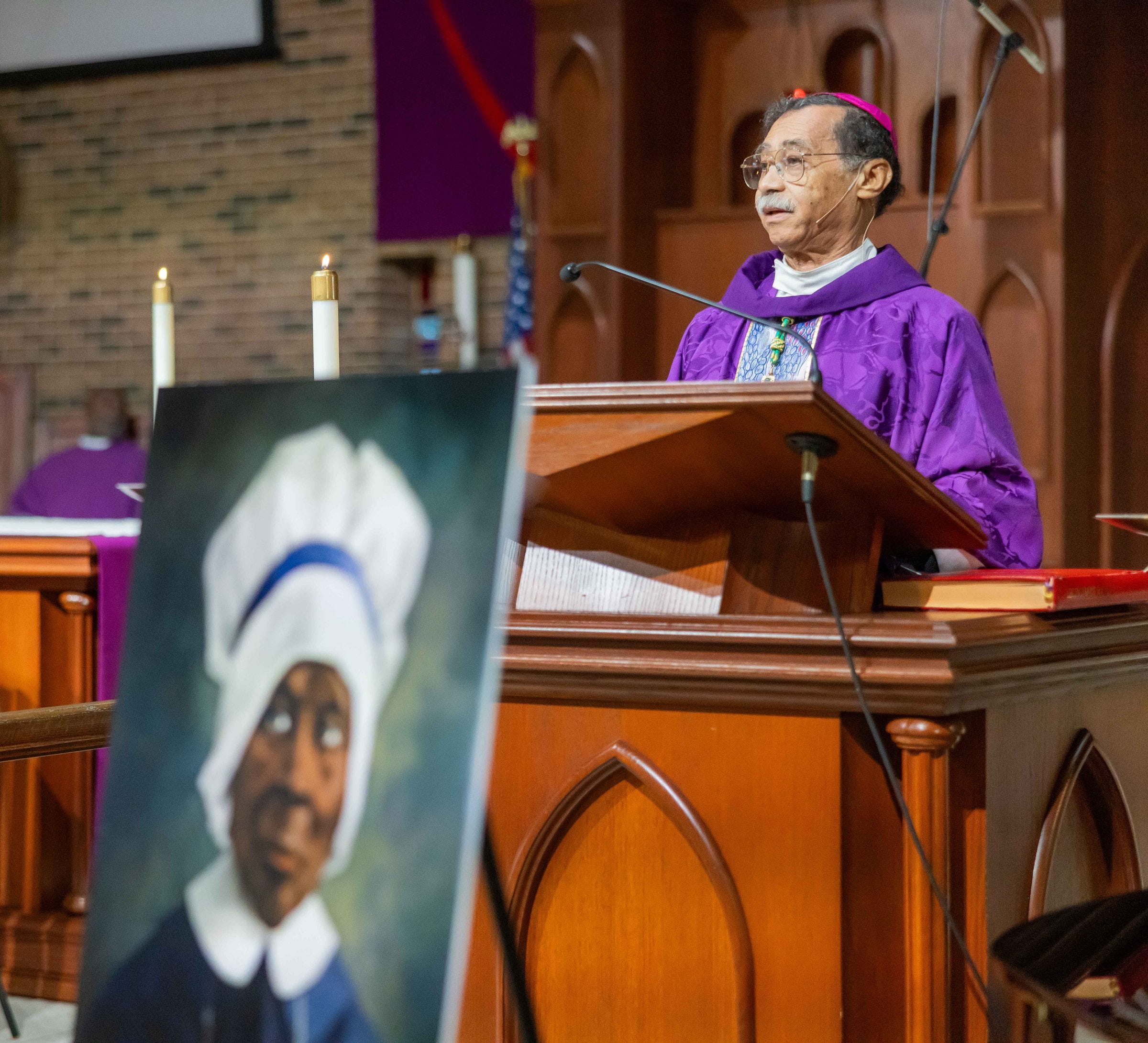 The piece describes the event, notes the “Saintly Seven” portraits near the altar, and then recounts Bishop Roy Campbell’s homily moment: reflecting on “Agnus Dei,” he says, “DEI means God is diversity, He is equity, and He is inclusion.”