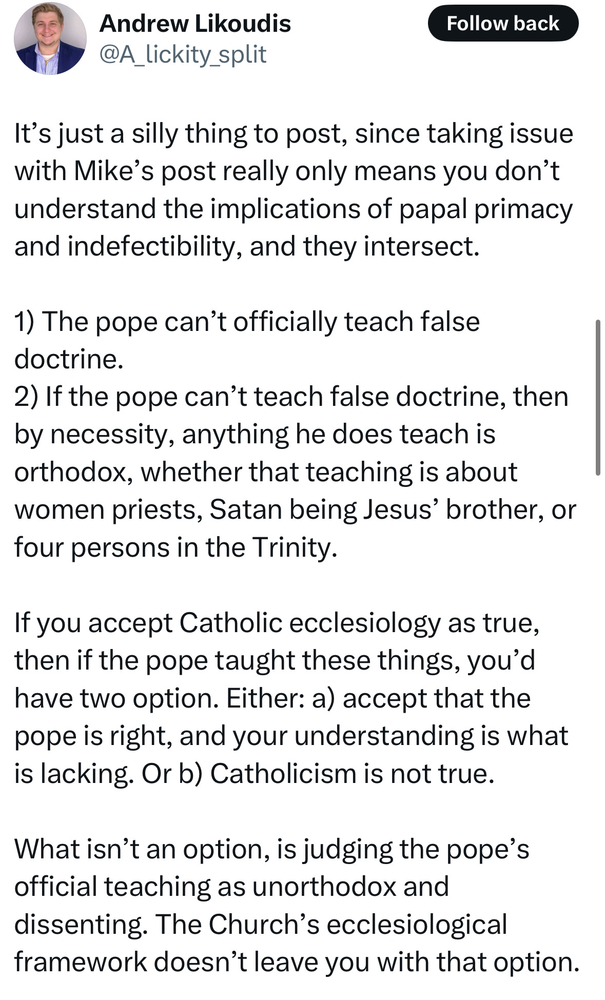 Andrew doesn’t want you to think about either option. He wants you to pick between two stupid things: (1) believe contradiction is orthodoxy, or (2) believe the Church is false.