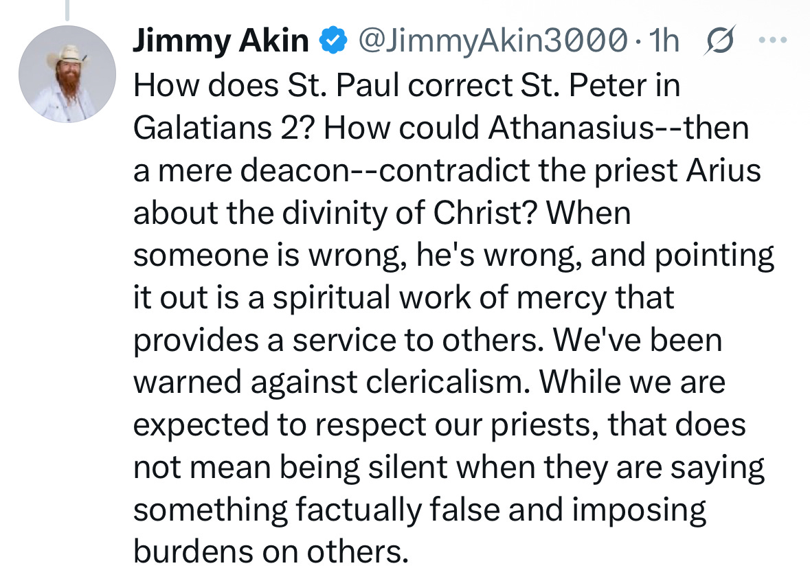 Pressed on X, he cites Saint Paul rebuking Peter in Galatians, and Athanasius contradicting Arius when Athanasius was still a deacon. When someone is wrong, he says, “pointing it out is a spiritual work of mercy.” We have been warned against clericalism. Respect for priests does not mean “being silent when they are saying something factually false and imposing burdens on others.”