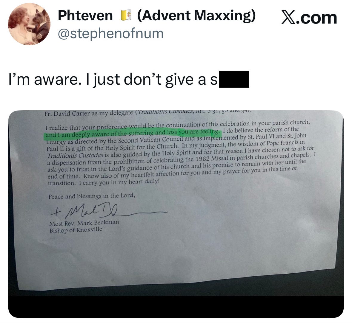 The bishop of Knoxville has written a long, sorrowful letter to traditional Catholics in Johnson City. He assures them he has listened to their pain. He acknowledges the spiritual fruit of the 1962 Missal. He thanks them for their letters and their testimonies.