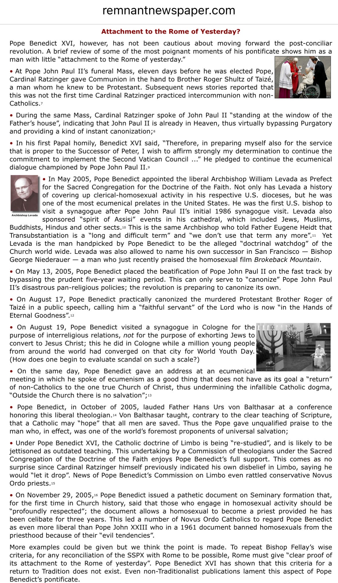They say Benedict’s “first allegiance has always been to the modernist New Theology.” They say he is the same Ratzinger who praised Vatican II as a “counter-Syllabus,” who insisted “there must be no return to the Syllabus,” and whose December 22 speech is “nothing on which to pin much hope” because it doubles down on conciliar religious liberty and “healthy secularity.”