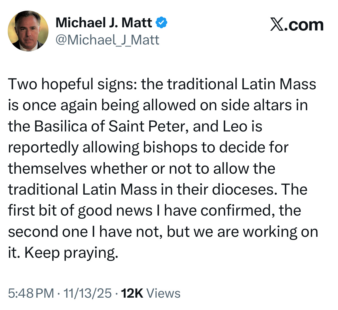 Latin Mass on side altars in St Peter’s. Rumors of Leo “allowing bishops to decide for themselves” about the TLM. The Remnant followed up with an editorial trumpeting the return of the Mass to “the Pope’s basilica” as the beginning of a glorious loosening of restrictions. Keep praying. Keep hoping. The Mass will not be denied.