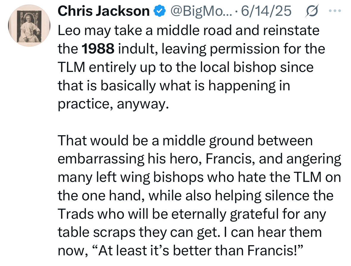 It was not prophecy. It was reading the room. Leo wants continuity with Francis without looking like Francis’s prison warden. Left-wing bishops want the TLM dead. “Conservative” cardinals want a fig leaf so they can tell their flocks they “saved the Latin Mass” while leaving Bergoglian theology intact.