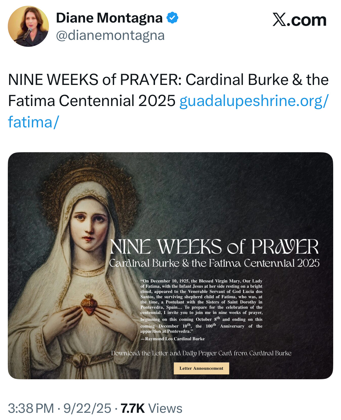 In September I said out loud what everyone with a pulse could see. The Fatima centennial novena pushed by Cardinal Burke, complete with nine weeks of carefully branded prayers, looked very much like stage-setting. You prime traditional Catholics for a big “answer” from Our Lady. You line up the conservative media to explain the miracle when the answer arrives. Then Leo grants an indult-style loosening and the talking points write themselves: