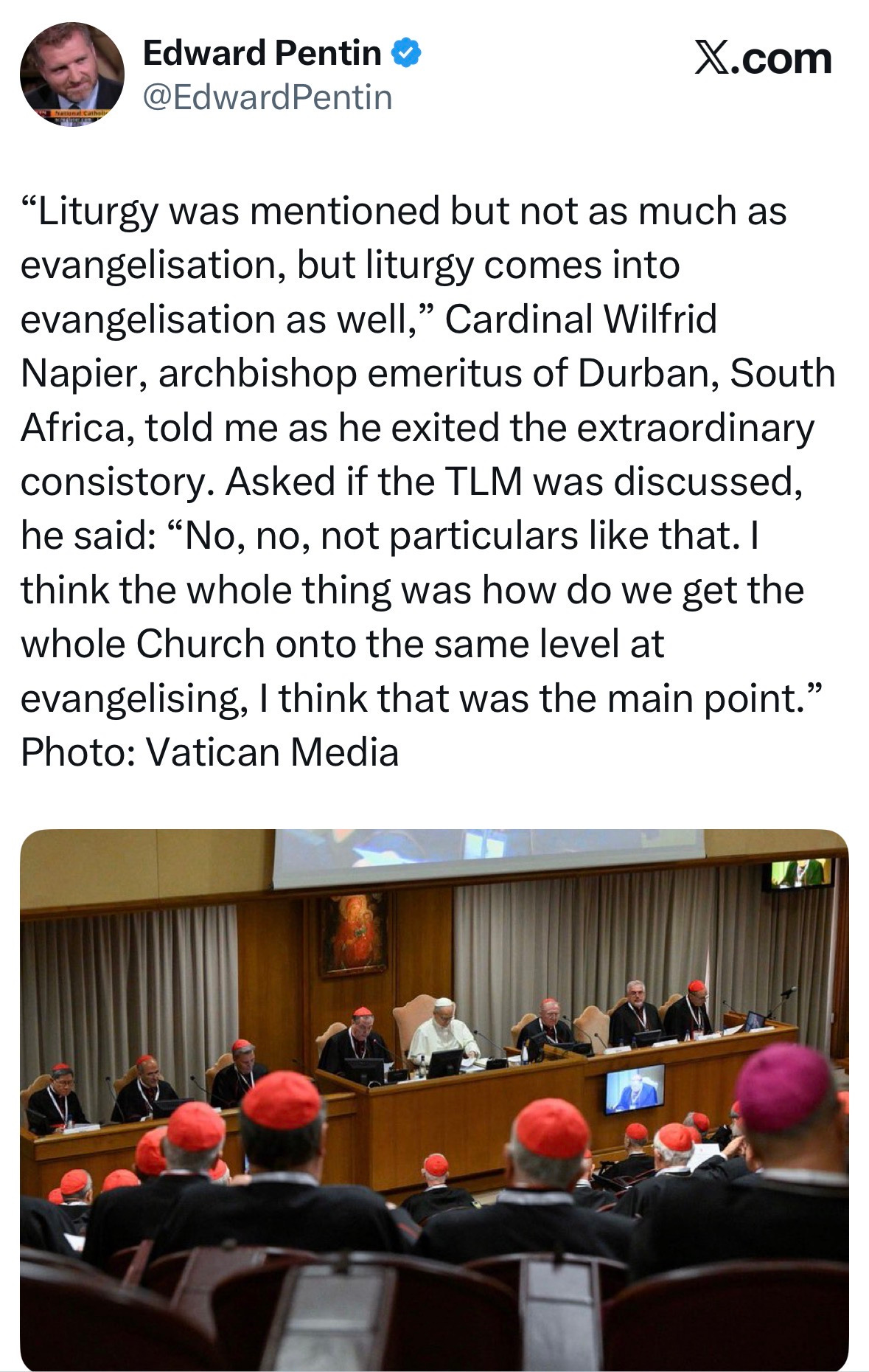 The first extraordinary consistory (Jan. 7–8) already offered a preview. According to multiple accounts cited by en.news, the Roman Rite never reached the floor in any serious way. Edward Pentin quoted Cardinal Wilfrid Napier describing the focus as evangelisation, with “no, no, not particulars like that” when asked about the Traditional Latin Mass. Cardinal Jean-Paul Vesco described the conversations in the register of “Eucharist” and “synodality,” a pair of words that now function like duct tape: they hold together whatever Rome needs to keep from being examined.