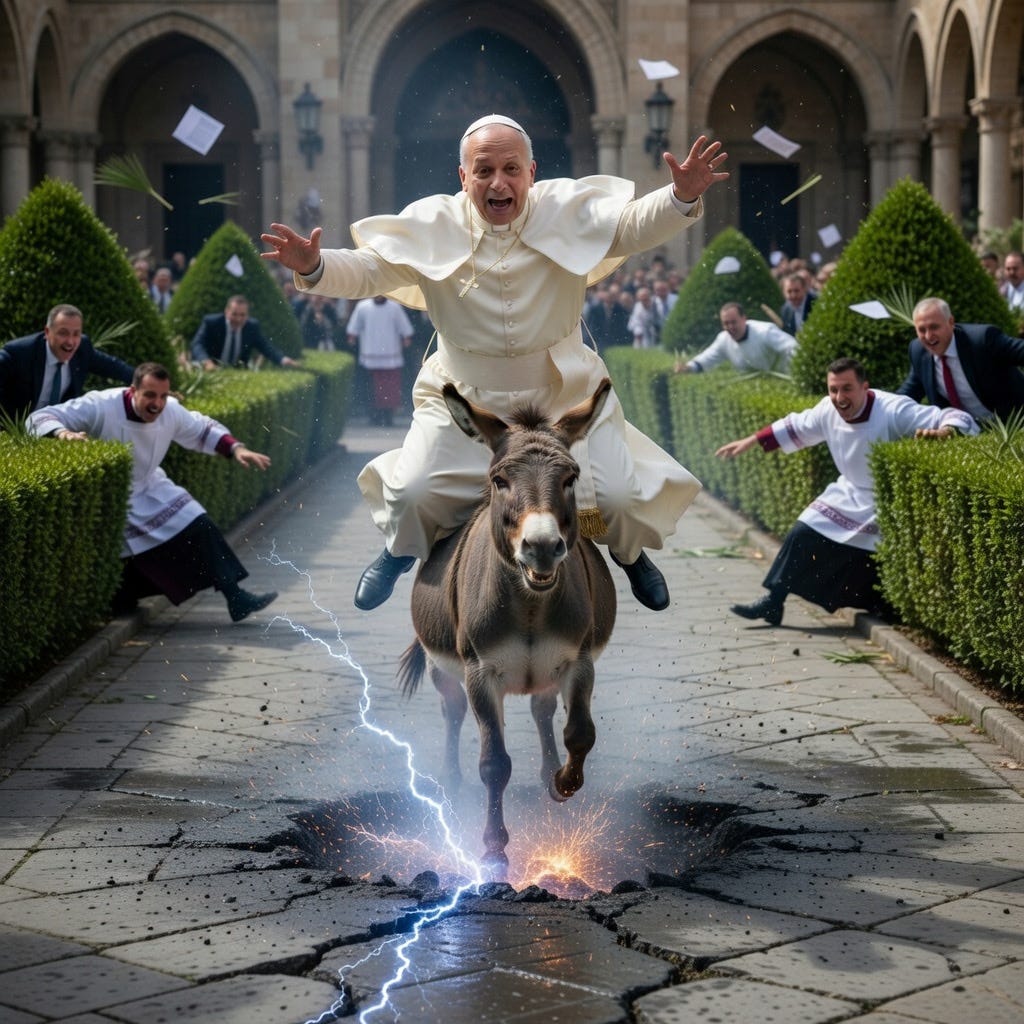 According to multiple Vatican sources, Leo XIV was riding into Palm Sunday ceremonies on a donkey in what the Holy See Press Office had described as a gesture of evangelical simplicity and ecological humility. The choreography was proceeding according to plan until a bolt of lightning struck the pavement directly in front of the procession, throwing Leo from the saddle and causing several liturgical planners to flee into nearby hedges.