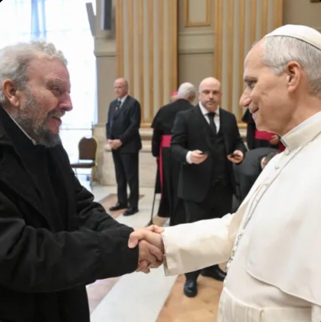 Kiko Argüello (left), co-founder and leader of the Neo-Catechumenal Way, is greeted by Leo XIV. Under post-conciliar papal patronage, the NCW’s leaders enjoy vast power over their members, leading to many abuses.